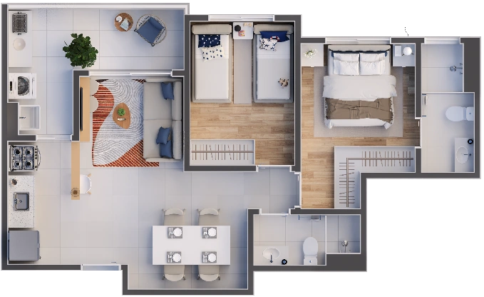 Conheça as opções de plantas disponíveis e encontre o layout ideal para sua rotina. Apartamentos entre 59m² a 71m², com configurações inteligentes, ambientes bem distribuídos e pensados para oferecer conforto, praticidade e bem-estar no dia a dia.